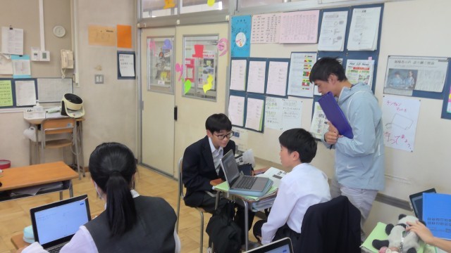 2学年 英語(研究授業) 公開日 2025/10/30 更新日 2025/10/30 2年生 10月30日身の回りにあるユニバーサルデザインについて調べ、相互に紹介しています。発音をタブレットで調べ確認したり、相互にアドバイスし合ったりしています。また、先生たちも授業に入り、一緒に授業について考えました。