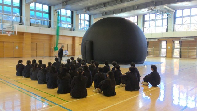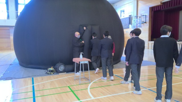 理科の出前授業 公開日 2025/12/01 更新日 2025/12/01 3年生 本日(12月1日)3年生が、アリーナでプラネタリウムを活用した理科の出前授業を受けました。太陽や星座の動きを分かりやすく説明していただきました。
