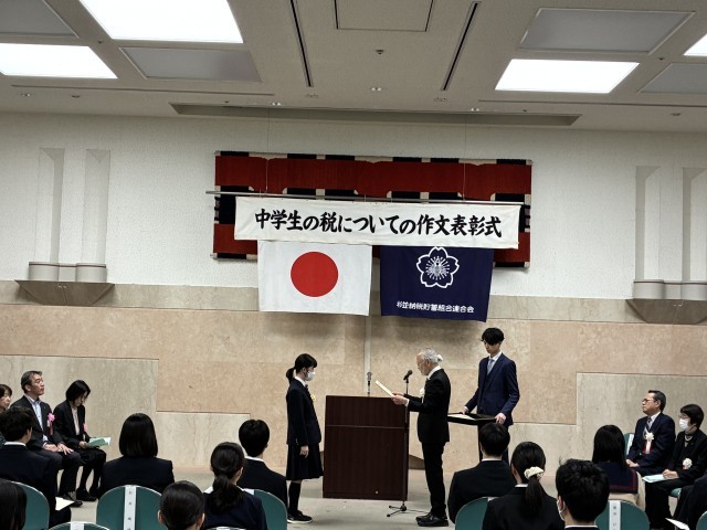 令和7年度中学生の『税についての作文』表彰式 公開日 2025/12/03 更新日 2025/12/03 全体 12月3日(水)令和7年度中学生の『税についての作文』表彰式が杉並区役所で行われました。阿佐中からは、3年生の女子2名が杉並納税貯蓄組合連合会金賞、銅賞をそれぞれ受賞しました。
