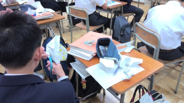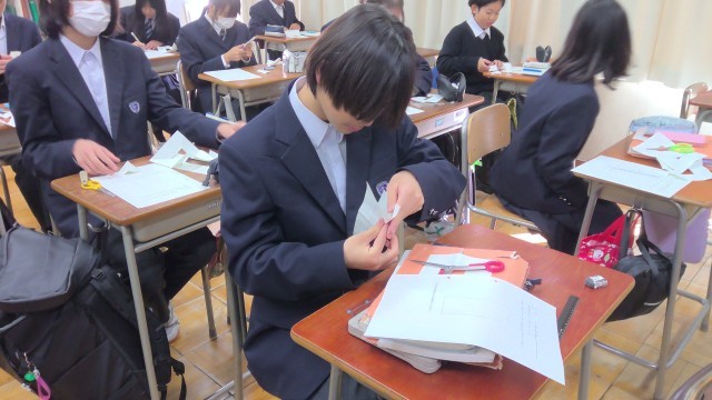 平面図形の単元で様々な(長方形、L字、T字など)図形が書かれた紙を折って、『一刀切り』にチャレンジしました。