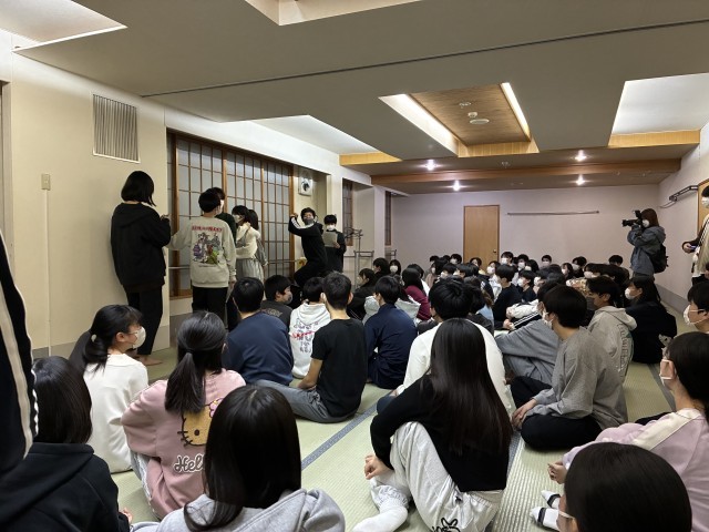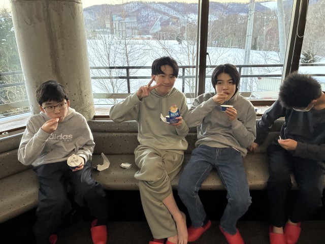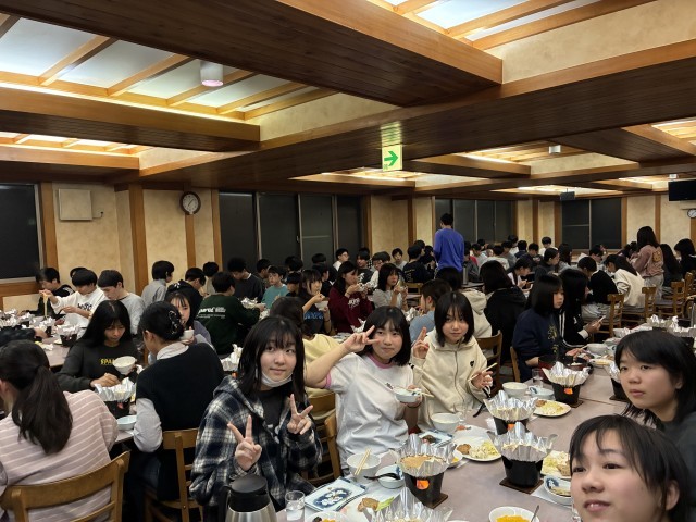 スキー実習の後はおやつタイムでアイスクリーム。入浴後はボリュームたっぷりの夕食です。スキー実習で体力を使い、みんな食欲モリモリ。夕食後、今日は大広間でレク係がアイディアをこらしたゲームで盛り上がりました。
