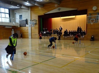 生徒の参加は自由で、5人1組でチームを作り、それぞれの選手が「ぐるぐるバットしてダッシュ」「バスケットボールでドリブル」をしながらリレーするゲームです。