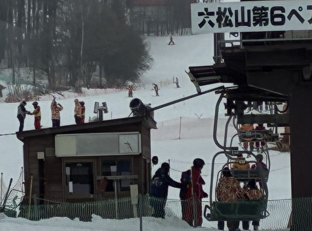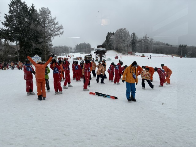 昨日とは打って変わって、曇り空の寒いゲレンデです。みんなで準備体操をして、ストックを持たないでリフトにドンドン乗り込んで行きます。