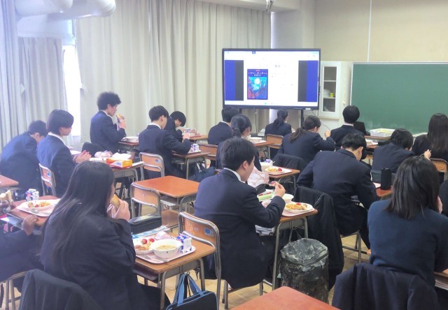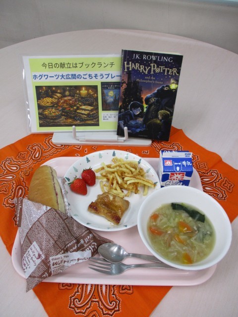 ハリー・ポッターに登場する料理を参考に、給食室の皆さんにご協力いただき、特別メニューが提供されました。当日は、図書委員会が作成した本の紹介スライドを見ながら、生徒たちはおいしく給食をいただきました。