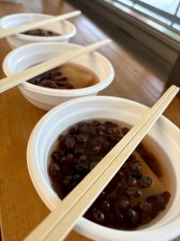 2日目のスキー実習後のおやつタイムはお汁粉です。温かく甘いお汁粉を求めて、ラウン...