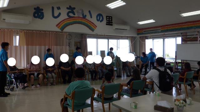 まずはデイサービスのフロアを訪れ、元気いっぱいにあいさつ。その後、「あじさいソング」で自己紹介を披露すると、会場はやさしい笑顔に包まれました。
