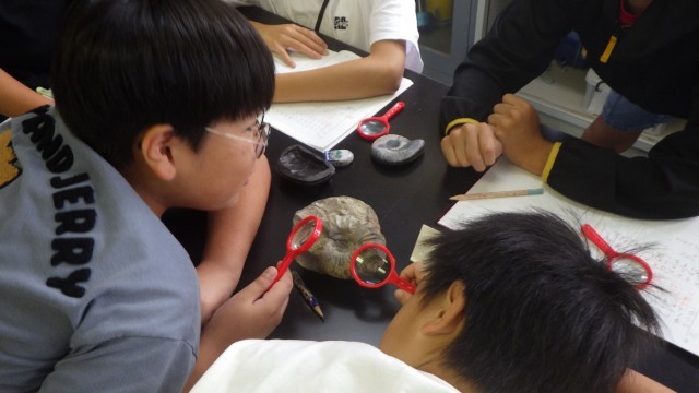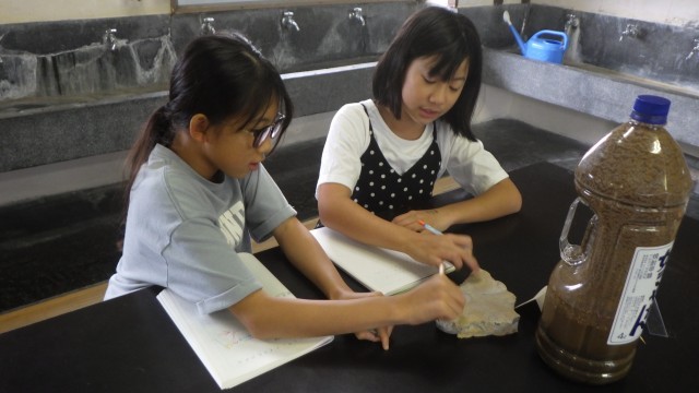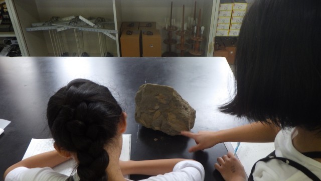 地層の体積実験を行っている間に、化石の観察を行いました。