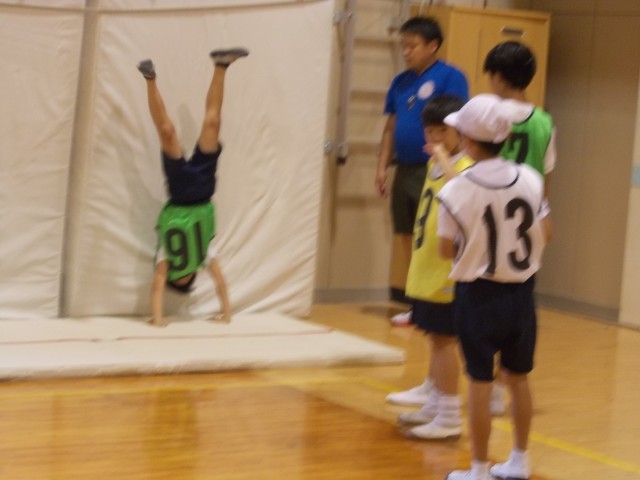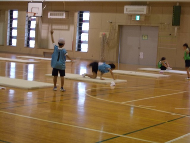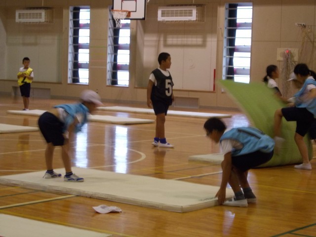 マット運動の第1時間目では、学習の進め方を確認しながら、前転や後転、側方倒立回転、壁倒立などに挑戦しました。自分がどのくらいできるかを確かめる活動も行いました。