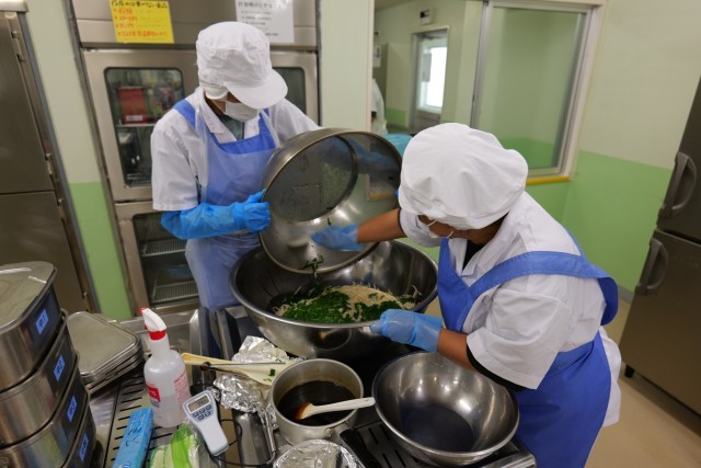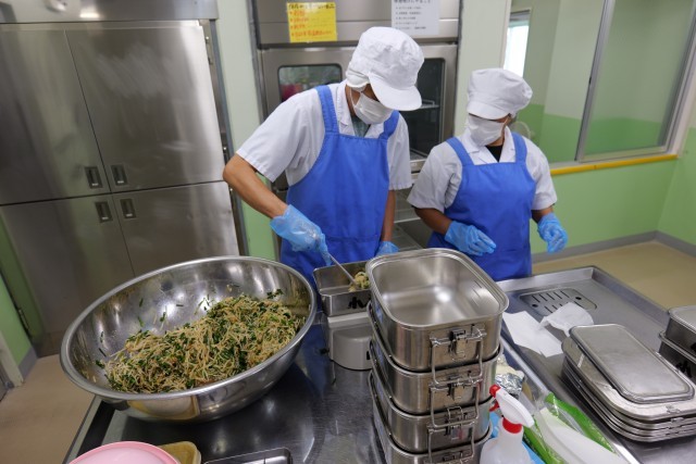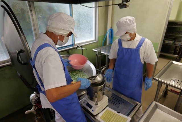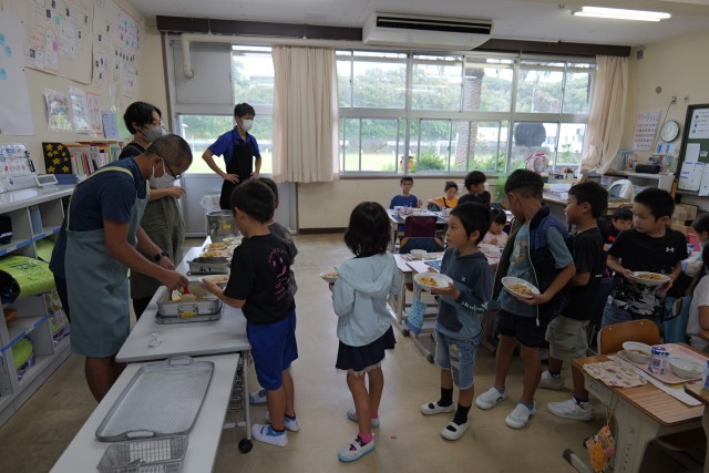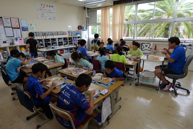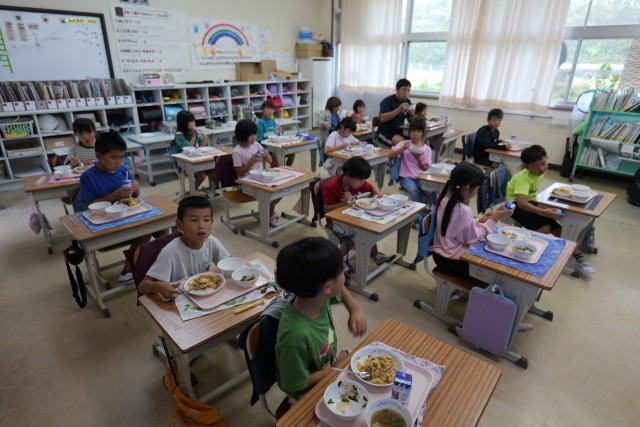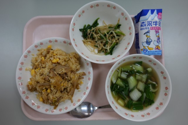今日のキムチチャーハンは、発酵食品であるキムチの旨さが生かされているメニューで、とても人気がありました。スープの青梗菜は、シャキシャキとした食感が感じられるよう、上手に調理されていました。1年生の教室では、各自、食べきれる量を考え、給食の時間を意識しながら食事を楽しんでいました。
