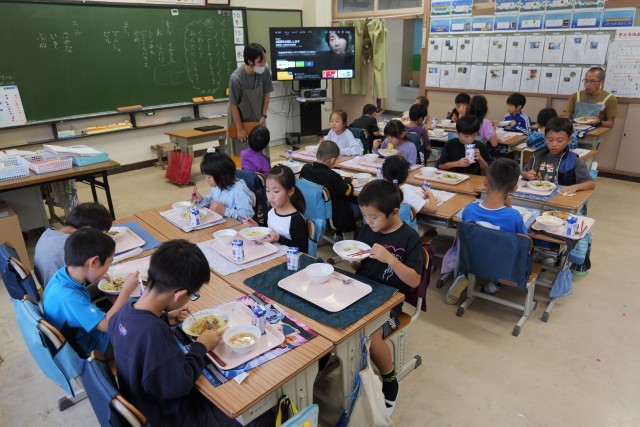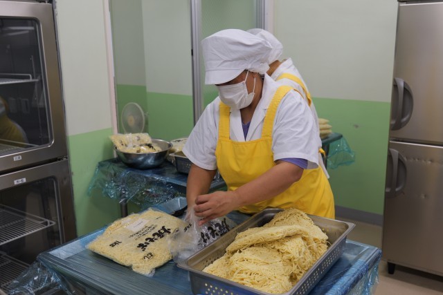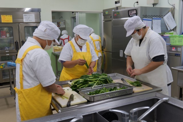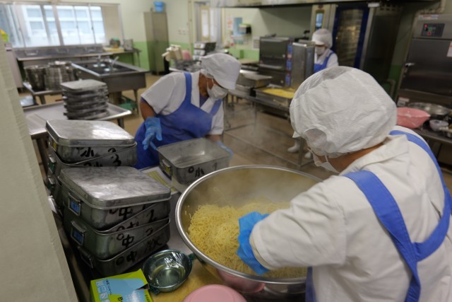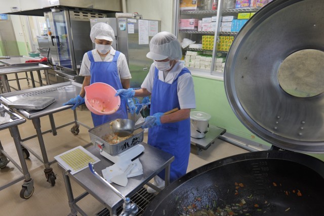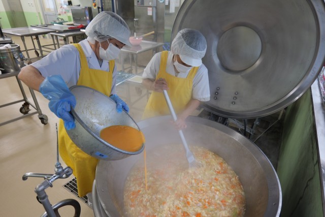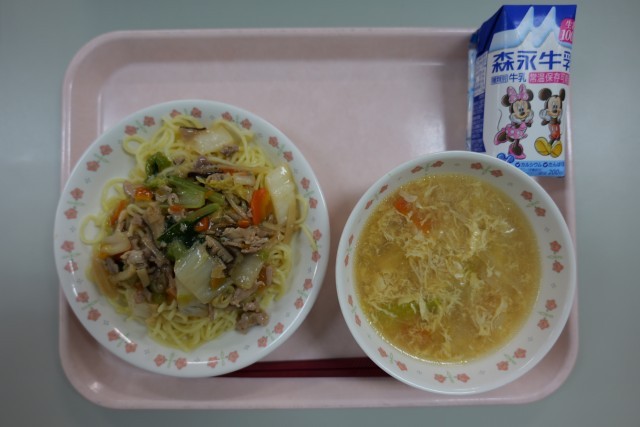 今日のあんかけ焼きそばは、具材がたくさん入った食べ応えのあるメニューでした。焼きそばの麺は、蒸し焼きにした後、180℃の高温で水分をとばしました。餡が麺と程よく絡み、食べやすく好評でした。