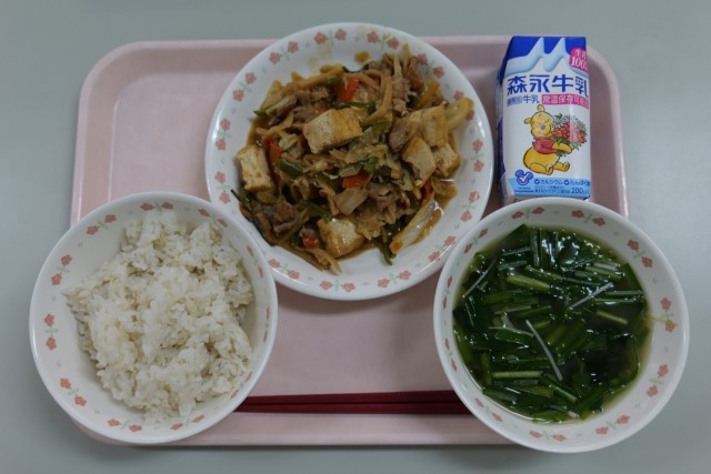 今日の炒め物には、生揚げ、豚肉、野菜がバランスよく使用されており、具だくさんで食べ応えがありました。味付けには、赤味噌や豆鼓醤などを使用し、ご飯との相性がよいメニューでした。