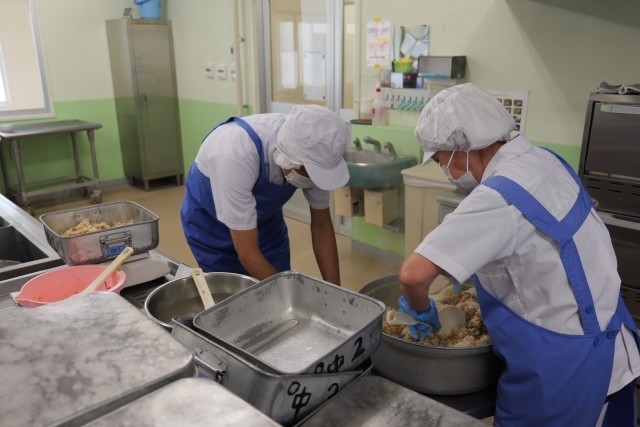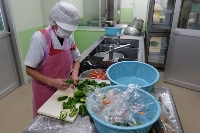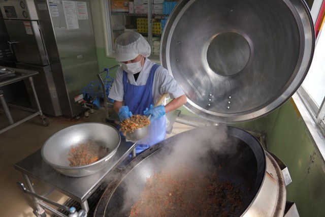 今日の魚のそぼろご飯には、三宅島近海で獲れたキメジを使用しました。今回も、いきいきお魚センターの職員さんが手作業で捌き、すり身に加工してくださいました。お魚の美味しさが際立つメニューで、みじん切りのピーマンも入り彩り良く仕上がりました。