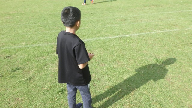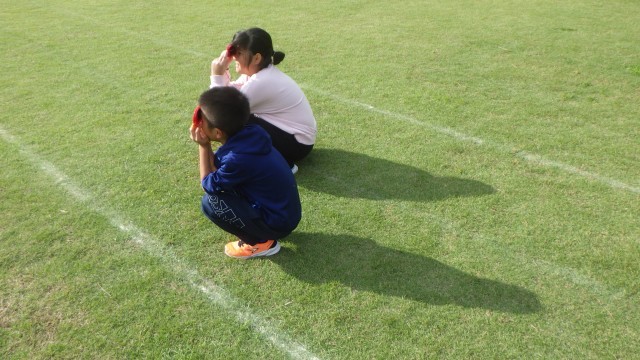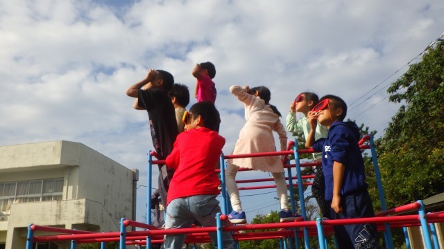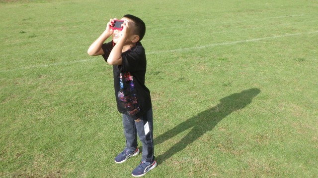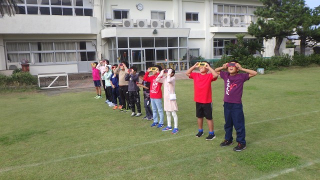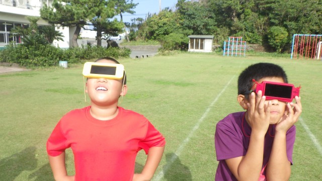 自分のかげを見付け、遮光プレートを装着しました。そして、空を見上げて回れ右をすると・・・「太陽だ!」「丸い!」「緑色っぽく見える!」と、太陽を見ることができました。