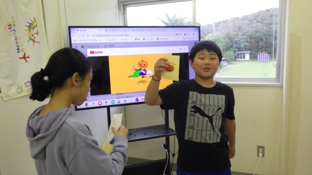 折り紙で作ったお菓子を交換したり、簡単な仮装をしてゲームをしたりして、楽しい時間を過ごしました。