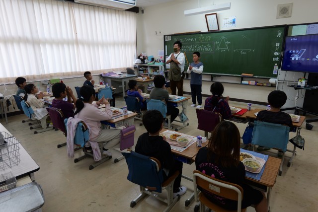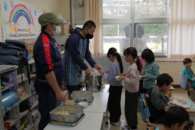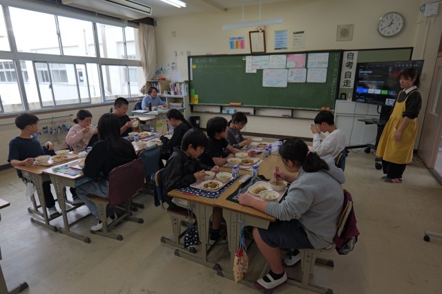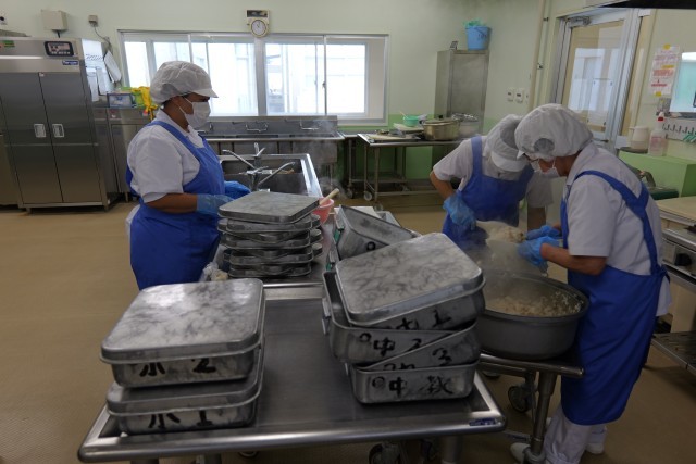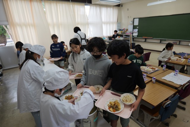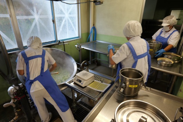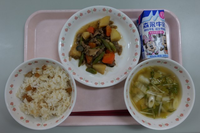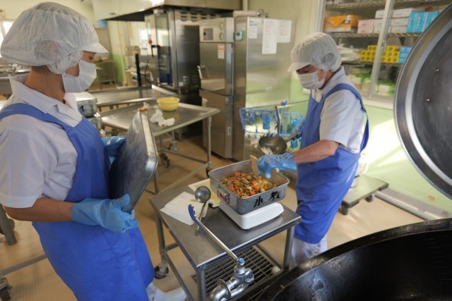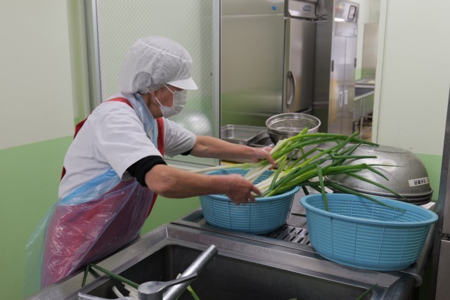 今日の大根飯は、サイコロ状に切った大根をごま油と醤油で炒め、白ご飯と混ぜ合わせたメニューでした。ごま油の風味と醤油の香ばしい香りが食欲をそそる一品でした。肉じゃがは、食材の形が綺麗に残るように、余熱を考慮して調理を行いました。具材の一つ一つに味が染みており、ご飯が進む味付けでした。本日使用した三宅島産の食材は長ネギでした。