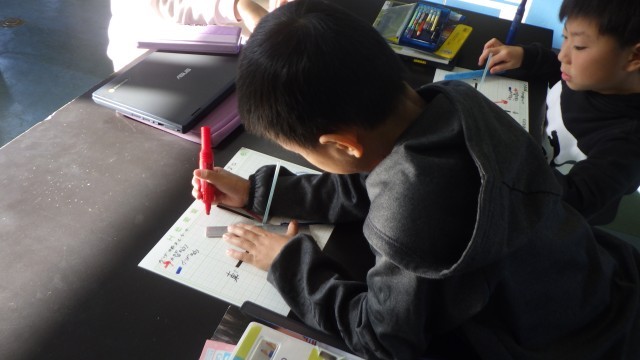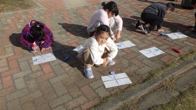 午前9時に見えた影に線を引き、太陽の向きを調べを行い、前回、12時に見えた太陽の位置と違うことに気付きました。