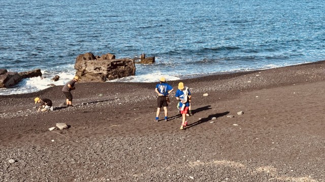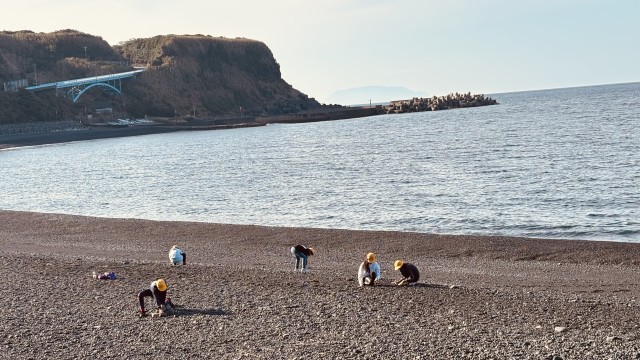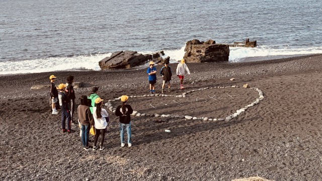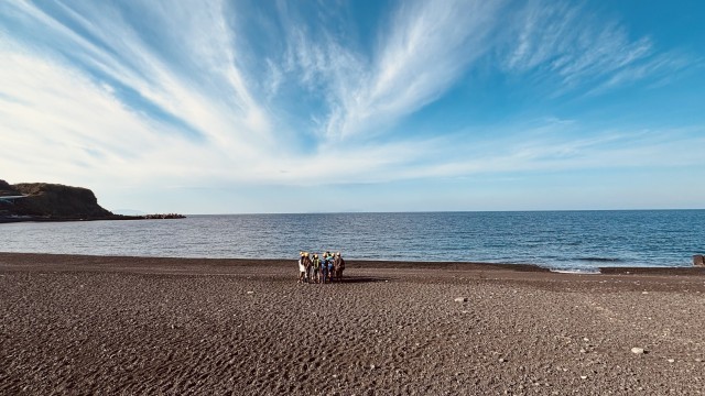 黒い火山砂の浜を歩きながら、子供たちは思い思いの石を拾い集め、円を描いたり、大きな文字をつくったり、バランスを探りながら石を積み上げたり。気がつけば、大人へ近付く年頃の子供たちが、まるで童心に帰ったような表情で夢中になっていました。