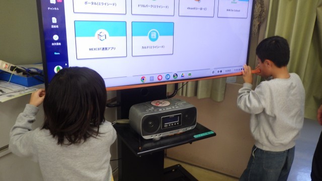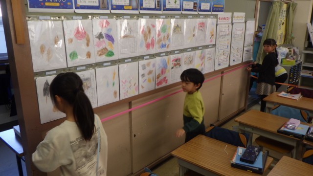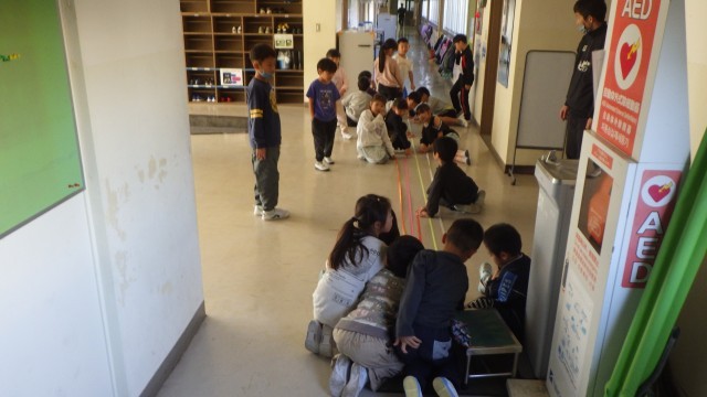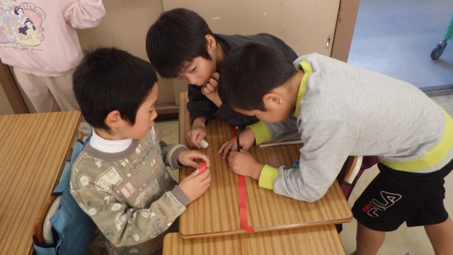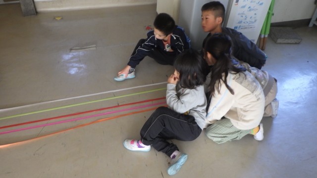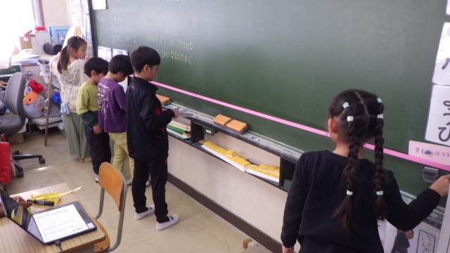 「端を揃えて比べる」ことを思い出しながら、短い物は黒板に貼って比べたり、長いものは廊下を使って比べたりしました。