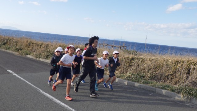中学年は学校の裏側の村道からスタートして伊豆岬灯台の手前で折り返して、全長2kmを走ります。