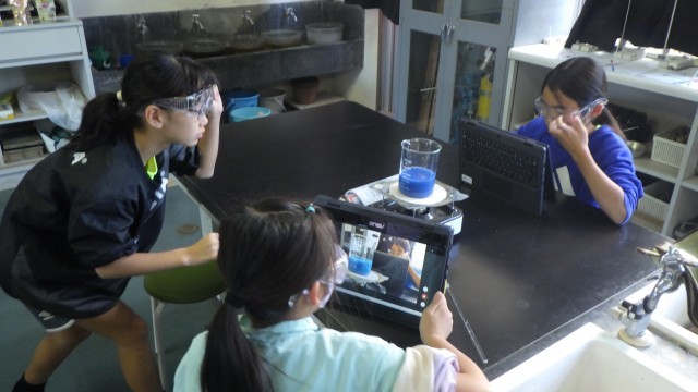 サーモインクを入れた水を加熱し、色が変わっていく様子を確かめました。