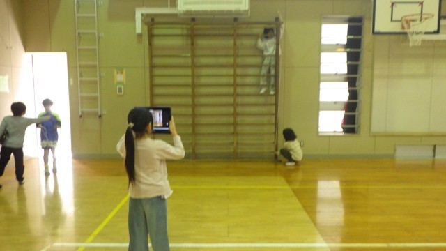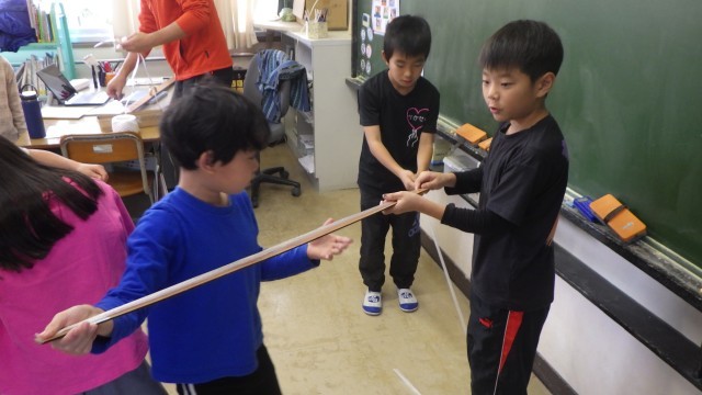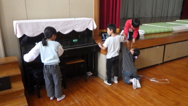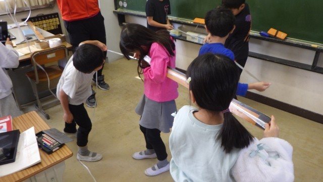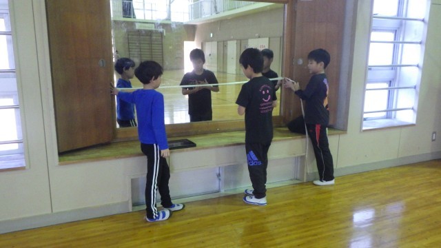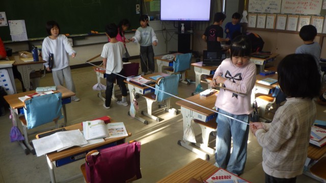 ビニールひもを使って、学校内の様々な物の長さを測りました。
