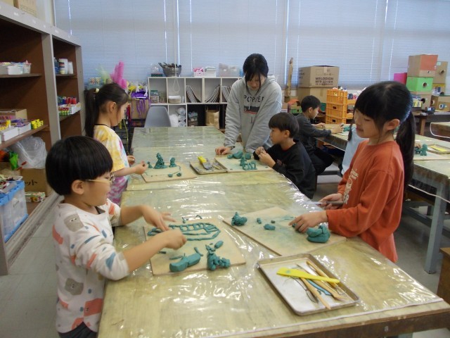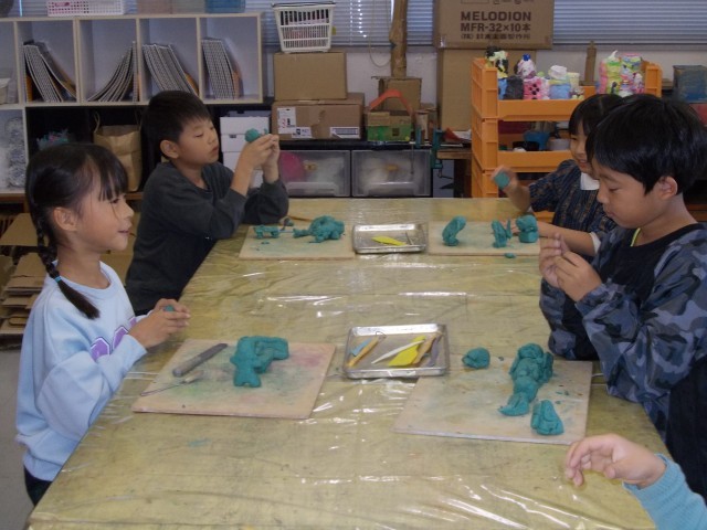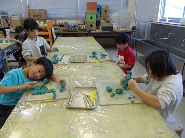 今日の図工の時間は、粘土を使って、思い出をかたちにするために自分やまわりの物の動きを工夫しながら、作りました。