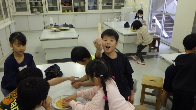 1学期に畑にポップコーンの種をまき、それが実り、調理できるまで十分に乾燥したので、皆で食すポップコーンパーティーを開催しました。子供たちは、この流れを体験することで、食べ物をつくることの大変さや、時間と手間がかかっていることを実感することができました。