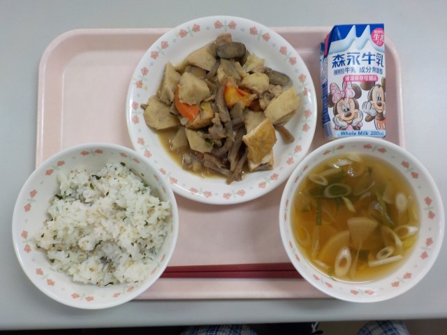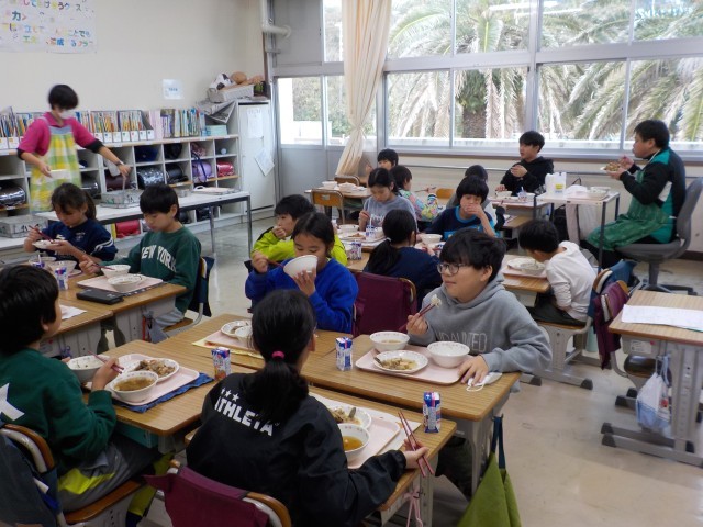 本日の給食では、日本の伝統的な郷土料理である「いもたき」を提供しました。いもたきの歴史は古く、収穫の秋に里芋の実りに感謝し、家族や地域の人々が集まって鍋を囲んだことが始まりといわれています。特に愛媛県大洲市などでは、川原でいもたきを囲む風習が今も大切に受け継がれており、人と人とのつながりを感じられる食文化とされています。今回の給食では、いもたきに使われる芋に三宅島の特産品である赤芽芋を使用しました。ねっとりとした食感と上品な味わいが煮物に適しており、非常に好評でした。給食を通して、季節の食材や地域に伝わる食文化への理解を深める機会となりました。