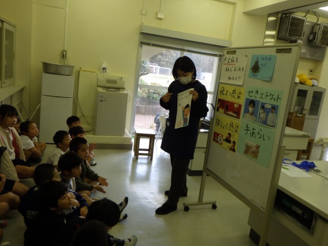 測定の前には、養護教諭より感染症予防について保健指導がありました。「咳エチケット」や「手洗い」の大切さについての話を、 子供たちは真剣な表情で聞いていました。