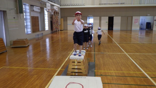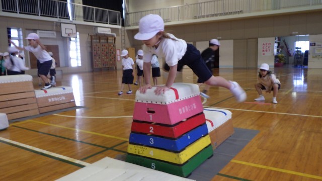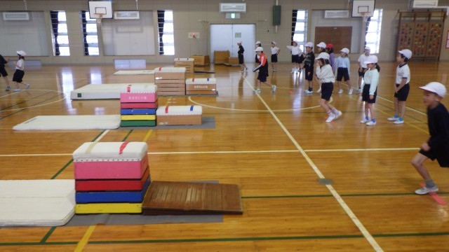 授業の後半は、チームで協力して場の設定をし、様々なとび箱ランドで遊ぶことができました。