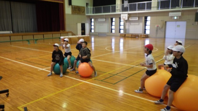 バランスボールに乗り「パプリカ」の曲に合わせてダンスをしたり、平均台やとび箱を使って「ドンじゃんけん」をしたりしました。