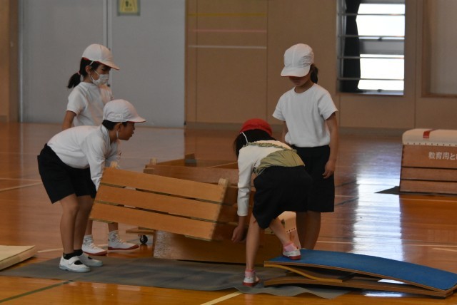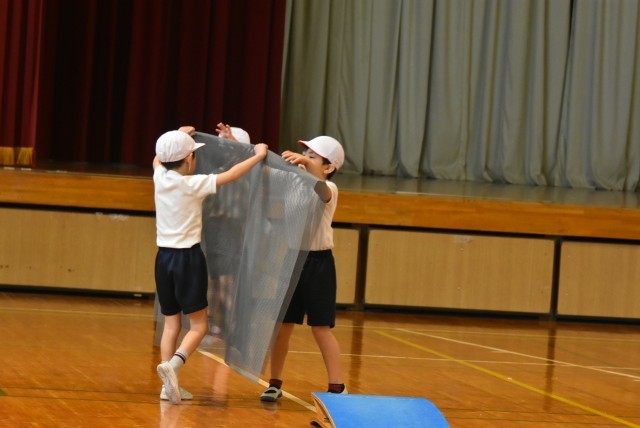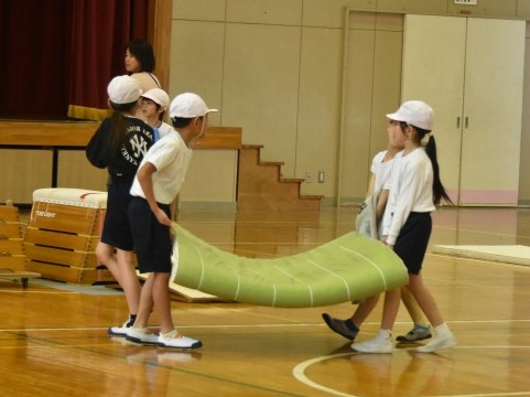 まずは、チームで協力して体育館にある道具をいろいろ準備して、それらを使って、相談しながら楽しめるあそび場を作りました。その後、実際に飛んだり、跳ねたり、お互いに作ったあそび場で楽しんで活動をしました。片付けもしっかりとチームで協力して行っていました。