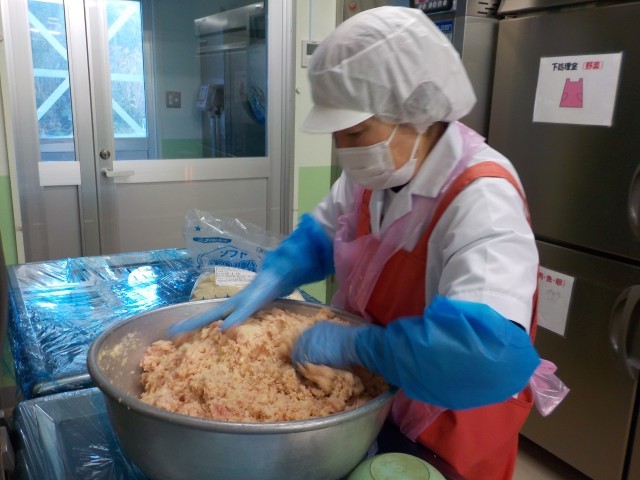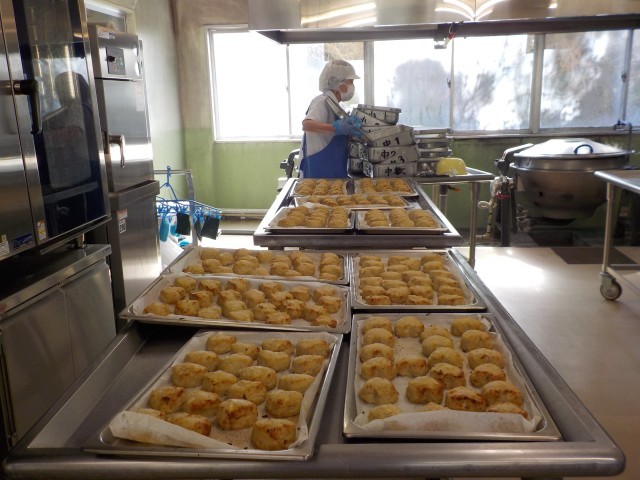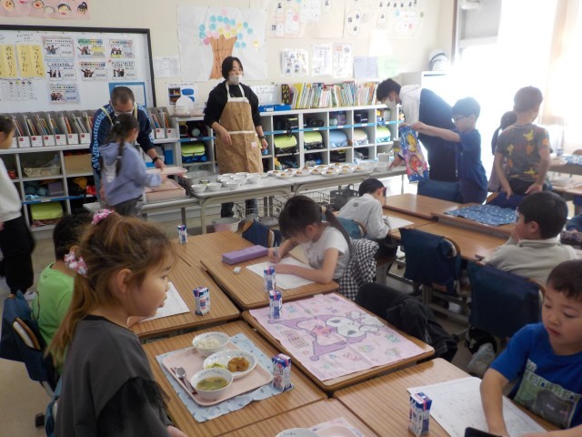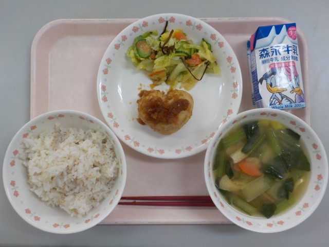今日は「このLove豆腐ハンバーグ旨すぎじゃね献立」でした。主菜の「豆腐ハンバーグ」は、調理員さんが一つ一つ愛をこめてハート形に成型し、こんがり焼き上げました。豆腐を多く使用しているため、非常に柔らかく食べやすいと好評でした。大根おろしの和風ソースも、ハンバーグと相性がよく、ご飯が進む味付けでした。副菜の「野菜の塩昆布和え」は、普段の給食でも登場する人気のメニューで、安定の美味しさでした。6年生考案献立はまだまだ続きます。