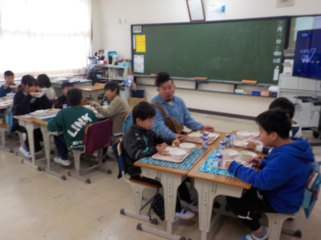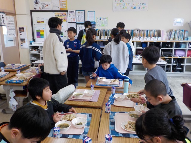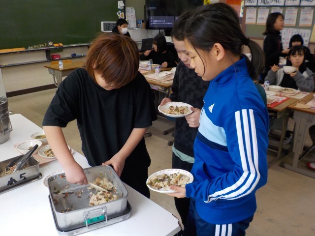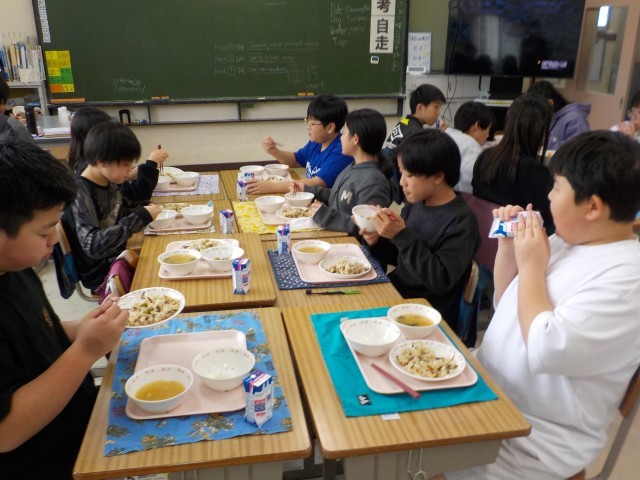 今日は、根菜や乾物などの噛み応えのある食材を多く使用し、噛む力や噛む意識を育むようなメニューでした。きんぴらご飯の具材には、味が染みており、食欲をそそりました。ひじきと切り干し大根のサラダは、ゴマ油を使用した中華風のドレッシングであったためか、食べやすいと好評でした。呉汁はかつお出汁の旨味が強く感じられる寒い日にぴったりのメニューでした。