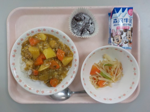 今日のカレーライスは、ゴロっと存在感のある鶏肉が使用されており、食べ応え満点でした。カレールーのとろみも程よく、お米が良く進む味付けでした。お誕生日ケーキは、程よい甘さでデザートにぴったりでした。