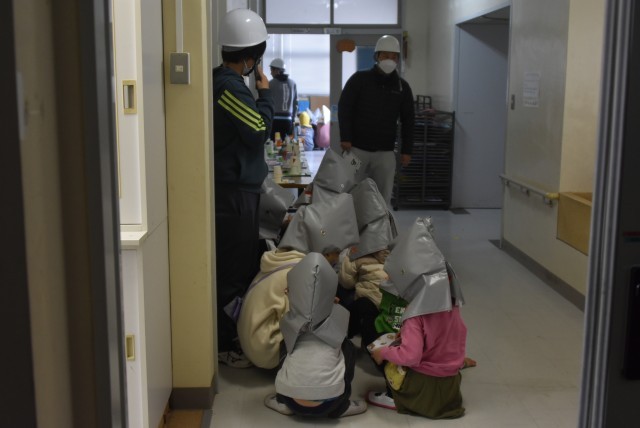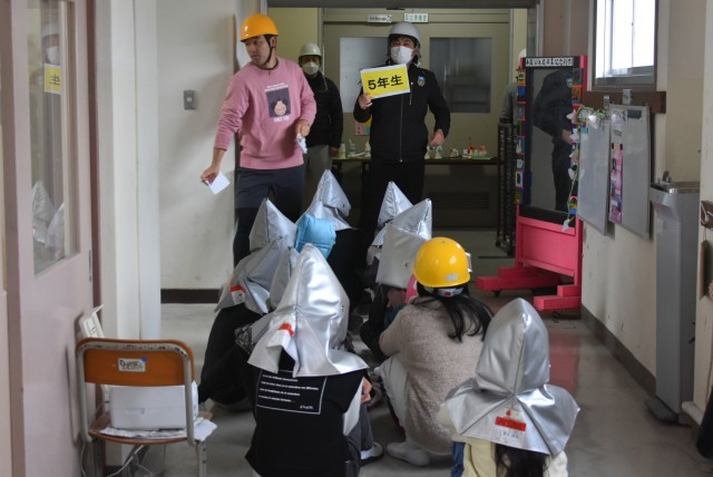 安全指導とも関連し、予告なく、地震の後に噴火が起こる想定の避難訓練をしました。