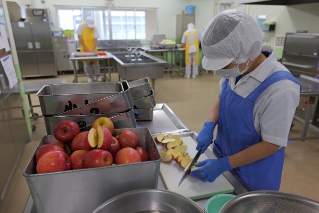副菜の「コールスローサラダ」には、お酢の効いたドレッシングを使用し、さっぱりとした味わいが楽しめました。デザートには、さわやかな甘さのりんごが登場し、満足感のある給食となりました。