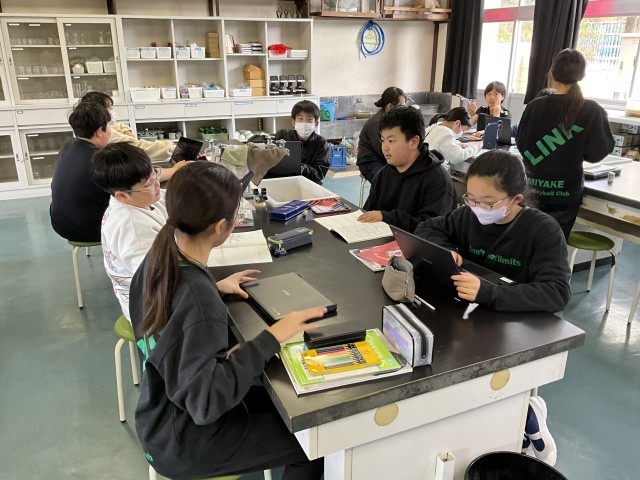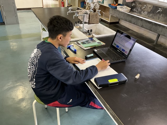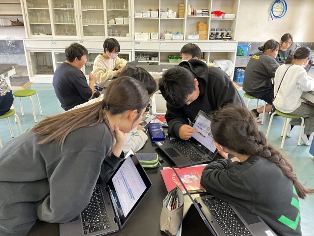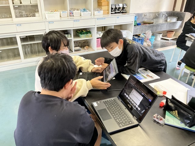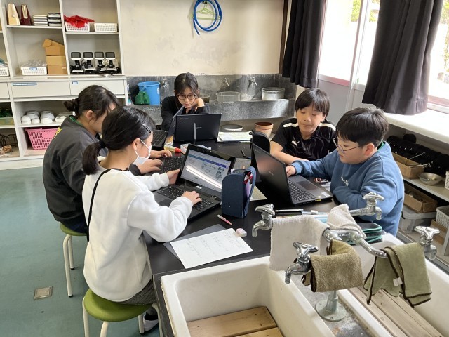 自分が調べているテーマと他のテーマが結び付いていることに気付き、共有している場面が見られました。