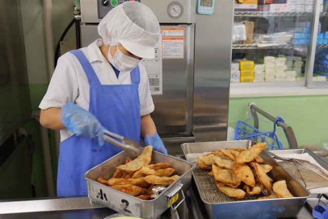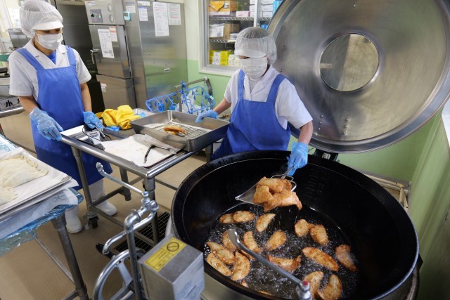 今日の給食の主役は、大人気のメニュー「明日葉入りジャンボ餃子」でした。リクエスト給食でも票数の多かったメニューです。