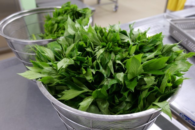 副菜である明日葉のごま和えは、明日葉の風味を強く感じるメニューで、食べたら健康になりそうな味をしていました。明日葉に含まれる「カルコン」は、他の植物にはほとんど含まれていない明日葉特有の非常に希少な成分で、健康や美容の分野で大きな注目を集めているポリフェノールの一種です。明日葉をたくさん食べて、午後も元気に過ごしました。