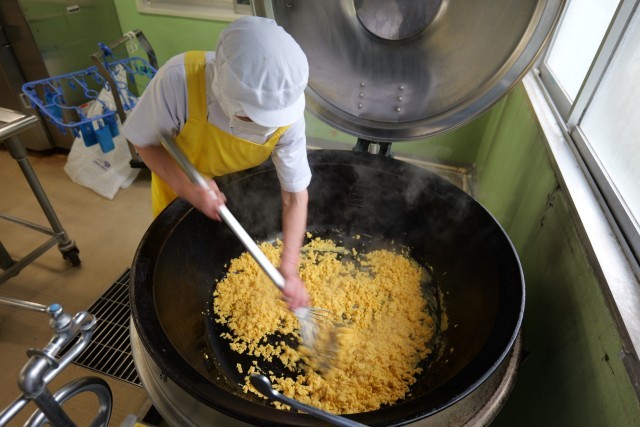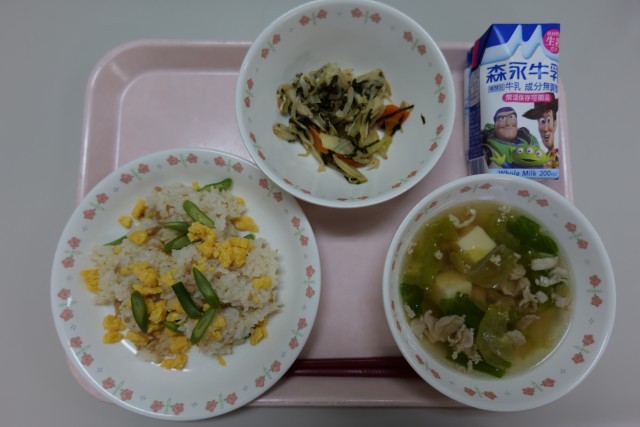 今日の「菜の花ご飯」は、春の訪れを感じさせてくれるようなメニューでした。本物の「菜の花」の代わりに「いんげん」を使用したため、子供たちも食べやすいように感じました。緑と黄色のコントラストが美しく、食欲が増す見た目をしていました。きれいに配缶してくださった調理員の皆様、ありがとうございました。