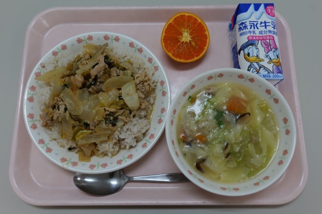 今日の「豚キムチ丼」はキムチの旨味が強く感じられる人気のメニューでした。豚肉のほかにも白菜や玉ねぎ、長ねぎなどを使用し、たくさん野菜を摂取することができました。