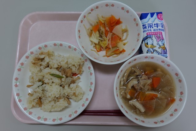 今日の主食である「こぎつねご飯」は、味の染みた油揚げが食欲をそそるメニューでした。「こぎつねご飯」という名前がついているのは、昔の人が神様の使いであるキツネに、好物の代わりとして油揚げを供えたことが理由だとされています。かつお出汁の旨味が感じられる優しい味わいの料理でした。