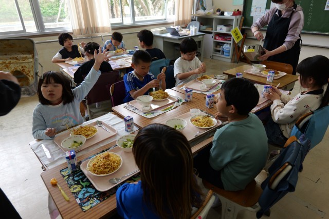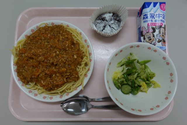 今日はお誕生日献立でした。4月生まれの皆様、お誕生日おめでとうございます。今日は給食の人気メニューである「ミートソーススパゲッティ」が登場しました。子供たちは口の周りを赤く染めながら、モリモリと食べていました。とろみ付けに「パン粉」を使用することで、程よいかたさのミートソースに仕上がりました。