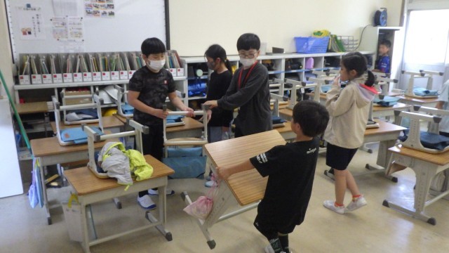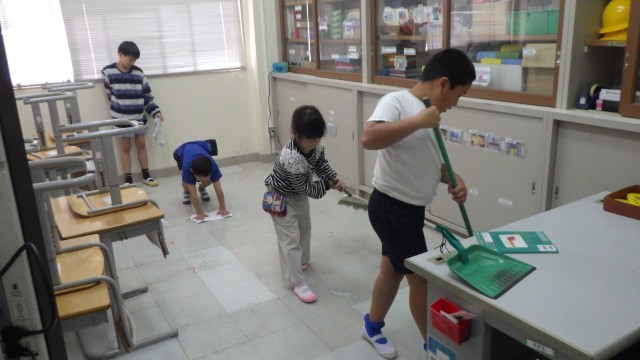 今日から1年生の5時間授業が始まり、たてわり班清掃にも加わりました。