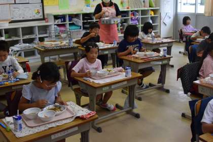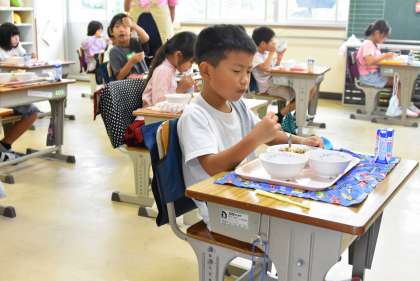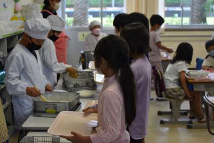 2年生は給食を取りに来る際、とっても元気にいただきますを伝えてくれます。給食の運び方も配膳もとても成長し、1年生の良いお手本になっています。