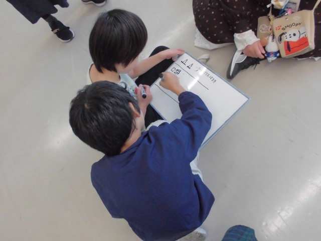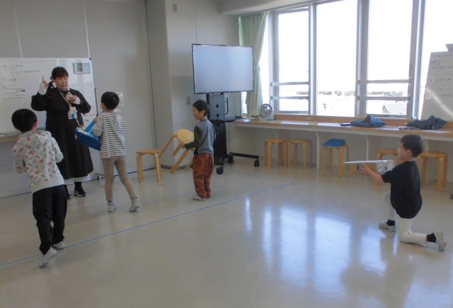 →引っ越し屋さんになって、協力して荷物を運ぶ活動です。「だるまさんが転んだ」の要素を取り入れ、掛け声に合わせて止まるルールにしています。作戦タイムをとって、どの荷物をだれが運ぶか、どの順番で運ぶかなどを相談しています。相談では、意見を伝えたら、それに対して返答をすることなど嚙み合った会話が大切です。より多くの荷物を運ぶためにはどうしたらいいか、いろいろなアイデアが出ています。自分の意見を伝えようとする子や、出た意見に対して、同意したり意見をしたりする子もいます。子供達同士で話し合いが成立することを目指して、助言しています。