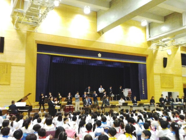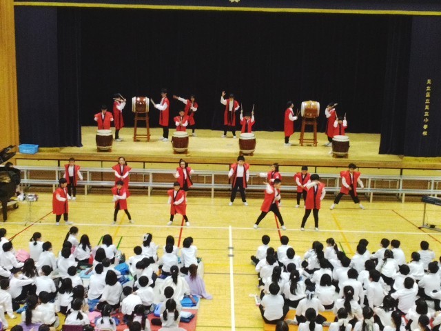 1205音楽会(児童鑑賞)その3 公開日 2025/12/05 更新日 2025/12/05 校長室 休憩後は、ひまわり学級の発表です。合唱と合奏、そして伝統のひまわり太鼓の発表をしました。特に、ひまわり太鼓では「ソーラン節」、太鼓に加え、踊りも加え、客席の子供たちも一緒に手を動かしている様子が見られるなど、会場が一体になりました。休憩前には、サプライズで先生たちの演奏も披露しました。