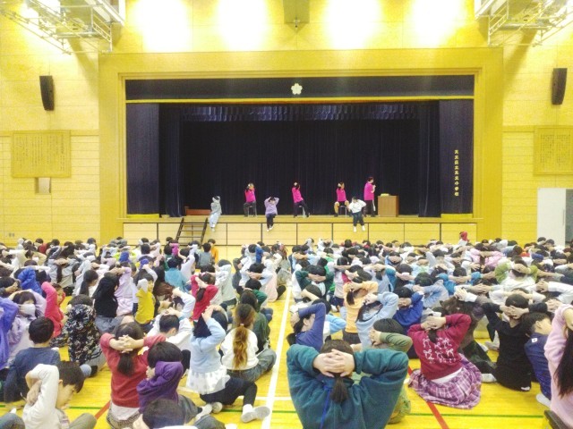 1215「せぼねっち体操」 公開日 2025/12/15 更新日 2025/12/15 校長室 12月から始まった背骨のストレッチ「せぼねっち」を全校児童でおさらい。「せぼねっち」ポスターに掲載されている「せぼねっちーず」の3人の先生と保健委員で動きの確認をしました。ぜひ、お家でも取り組んでみてください。