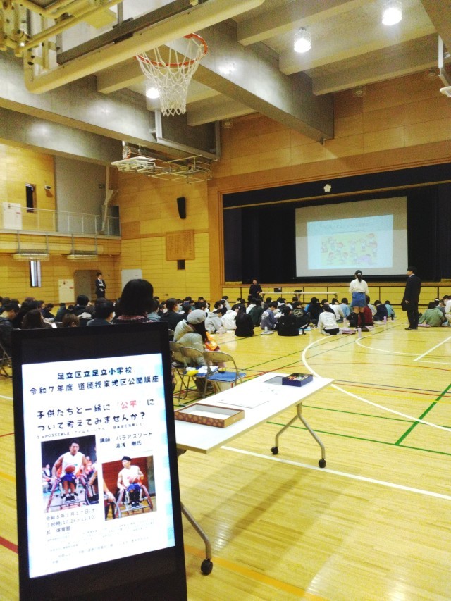0117道徳授業地区公開講座を実施しました 公開日 2026/01/17 更新日 2026/01/17 校長室 本日は今年度最後の土曜授業として道徳授業地区公開講座を行いました。すべての学級において道徳授業を公開するとともに、6年生、地域、保護者を対象にした特別授業を行いました。車いすバスケなどで活躍されているパラアスリートの湯浅剛様をゲストに「公平」について学びを深めました。